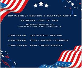 The American Legion Post 492 in West Lafayette will host a 2nd District Meeting followed by a Homecoming Blacktop Party. There will be a Corn Hole competition, Food, raffles, live music from the Cheese Weasels, and a bonfire. Come out and welcome our 2nd District Commander Jill Wable home and enjoy the festivities. Proceeds to benefit the Post 492 Post Revitalization Fund and American Legion Foundation. Have a great time while supporting a good cause. Open to the Public and family-friendly.